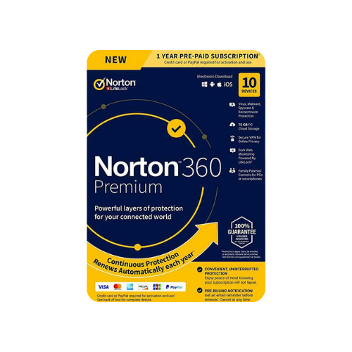 Norton 360 Premium is a powerful package from the Norton 360 range and protects up to 10 devices. With advanced features such as secure cloud storage, PC optimisation, parental controls and personal data protection, it offers a complete security solution to ensure maximum protection for you and your family.